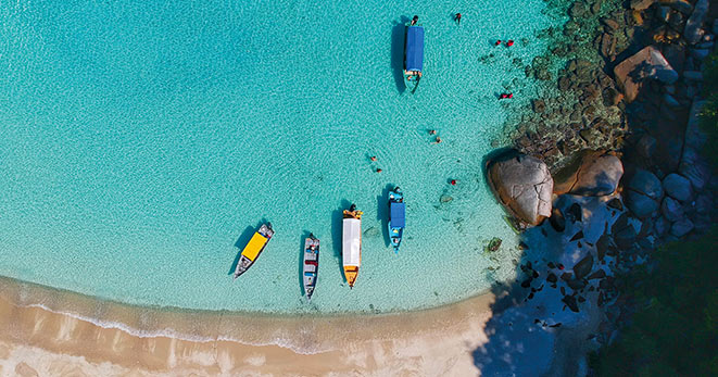 È l'Oriente perfetto per l’estate: sole, mare calmo, spiaggia bianca, acqua trasparente. E Redang è un’isola bellissima, con una foresta che arriva a lambire spiagge candide, un merletto di insenature e baie dove si arriva pagaiando su una canoa e si resta, se si vuole, in beata solitudine. Si raggiunge in barca, un’ora di piacevole traversata da Kuala Terengganu.