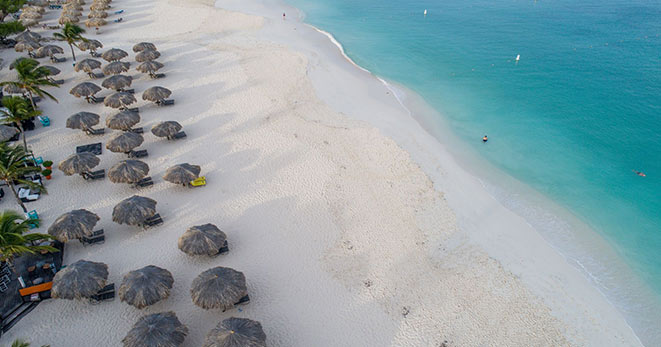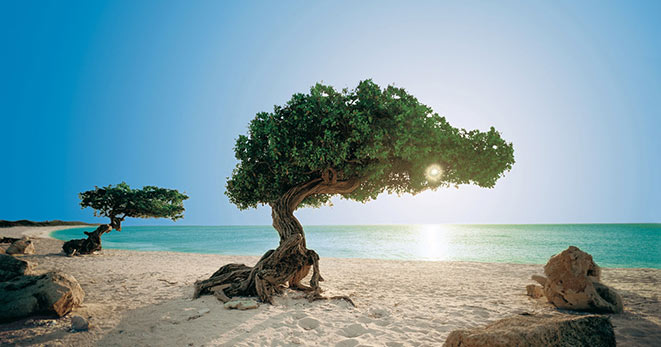 L'isola felice: piccola, lunga appena 30 chilometri, tranquilla, bellissima, con giornate e ore di sole che la rendono la più "illuminata" dei Caraibi. E anche la più colorata: tra cielo e mare e terra sfoggia tutte le tonalità del celeste e dell'azzurro a regalare un mare che ha pochi eguali. E sabbia soffice, spiagge candide. Come la trionfale Eagle Beach, considerata fra le più belle del mondo.