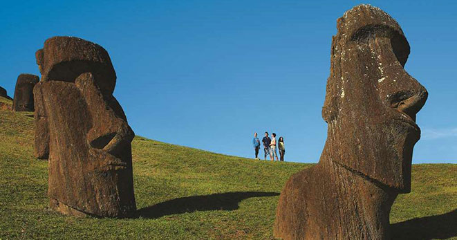 Poca fantasia ma scelta molto affascinante. In lingua nativa Rapa Nui significa grande rapa e si trova nell’Oceano Pacifico a 3.600 miglia ad ovest delle coste del Cile. Il territorio dell’isola, appena 117 chilometri quadrati, si compone di tre vulcani, Poike, Rano Kau e Terevaka, ed è uno dei luoghi più isolati del mondo tanto che i primi abitanti svilupparono una propria cultura differente da qualsiasi altra e il loro sistema di scrittura ideografico, ad esempio, non ha alcun punto di contatto con altri. E al contrario di quello che si potrebbe pensare in base alla posizione geografica, sono stati i polinesiani a colonizzare questa isola e non i sudamericani, anche se erano più vicini. Gli antichi abitanti coltivavano l’arte della scultura e la prova sono le oltre 600 colossali statue di pietra presenti nell’isola, i moai, teste giganti che raggiungono un’altezza di oltre 12 metri e pesano 80 tonnellate ciascuno. Molti dubbi sono stati espressi sull’origine di queste statue, che sono oggi il vero simbolo dell’Isola. C’è chi ha sostenuto che le antiche popolazioni non avrebbe potuto in alcun modo realizzare opere così grandi e c’è stato perfino chi ha sostenuto che non fossero opera umana ma di qualche civiltà aliena, perché le caratteristiche dei volti raffigurati non assomigliavano a nessuna popolazione terrestre. In realtà un attento esame fa emergere notevoli somiglianze con le caratteristiche somatiche degli abitanti dell’isola.