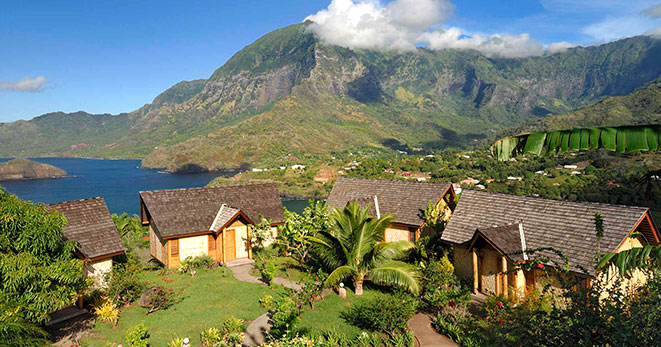 Domina la baia di Taiohae, a 50 metri di altezza dalla spiaggia di sabbia nera. Una posizione spettacolare, con vista superba anche dai bungalow, costruiti con materiali locali e decorati da artisti del luogo. L'atmosfera è rilassata, grazie anche alla calorosa ospitalità polinesiana. A disposizione degli ospiti una piscina a sfioro e un ristorante che serve piatti francesi e polinesiani.